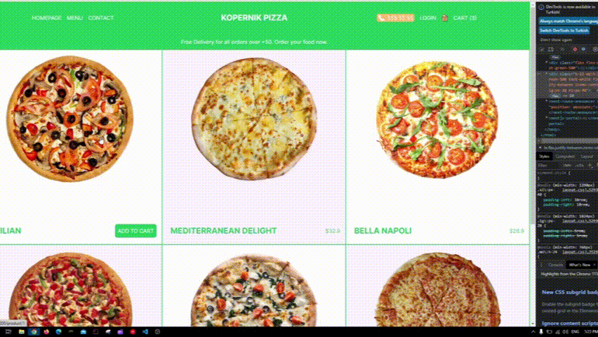 Kopernik Pizza is a responsive and dynamic restaurant ordering app, meticulously crafted to offer a seamless experience across all devices. Utilizing Tailwind CSS, it combines stunning visuals, including fancy buttons, captivating images, and engaging animations, ensuring an immersive user journey. From smartphones to tablets and desktops, Kopernik Pizza adapts effortlessly to various screen sizes, providing customers with an intuitive and enjoyable ordering process. Whether craving pizza, pasta, or salads, this app delivers a responsive interface that guarantees a delightful dining experience anytime, anywhere.